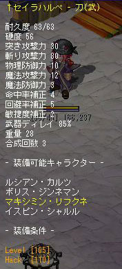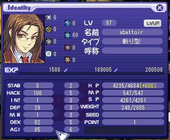 LV:97 STAB 3 HACK 100 INT 1 DEF 30 MR 1 DEX 82 AGI 90